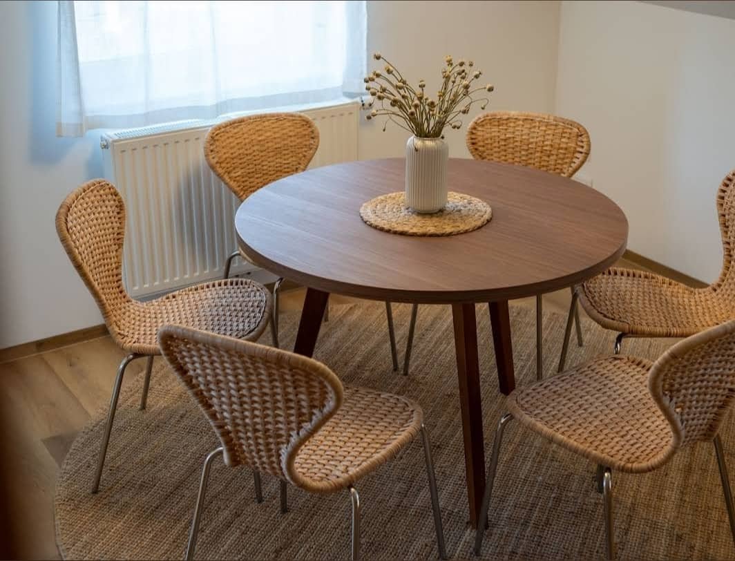 The apartment features a spacious and bright living area, a fully equipped kitchen, a modern bathroom, and a comfortable dining area. Large windows offer pleasant views of the surrounding mountains, creating a warm and relaxing atmosphere for your stay.